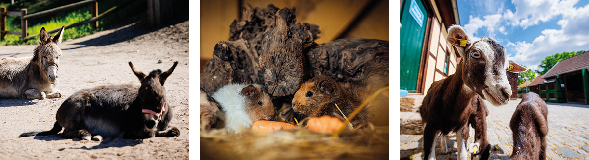 Auf dem Kinderbauernhof sind u.a. Esel, Schafe, Ziegen, Kaninchen, Puten und Hühner zu Hause. Der typische Thüringer Dreiseitenhof mit Bauernhaus, Garten, Stallungen und Scheune gibt einen Einblick in den traditionellen bäuerlichen Alltag vergangener Zeiten.