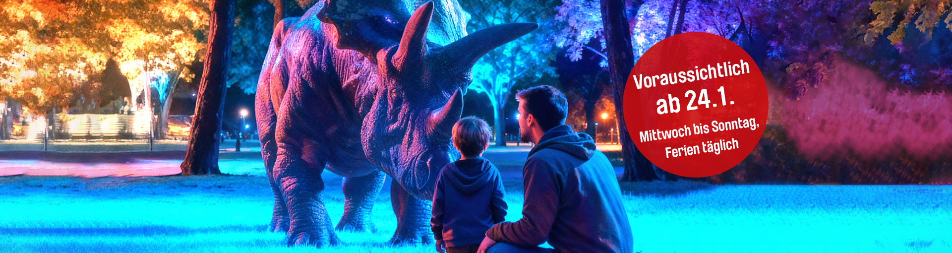Erleben Sie diesen Winter ein unvergessliches Abenteuer zwischen gigantischen Urzeitriesen! Lebensgroße Dinosaurier erwachen im Schein bunter Lichter zum Leben – sie bewegen sich, brüllen und machen Ihren Abendspaziergang zu einer Reise in die Vergangenheit.