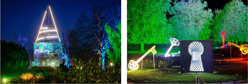 Staunen Sie über eine 10 Meter hohe Wasserfontäne, auf die Videos projiziert werden, den bunt beleuchteten Aussichtsturm, verschiedene Lichtgestalten und viele weitere bezaubernde Lichtinstallationen.